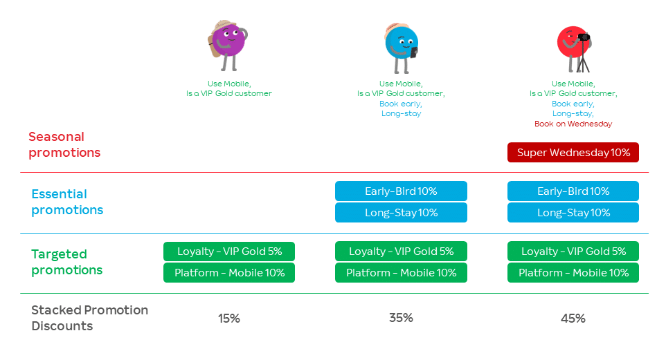 Die verschiedenen Arten von Promotionen können wie unten beschrieben kombiniert werden, damit Sie wettbewerbsfähige Preise anbieten und Ihre Buchungen ankurbeln können. Die Stapelung erfolgt gemäß den Bedingungen der jeweiligen Promotion, einschließlich der Anspruchsberechtigung des Kunden.
