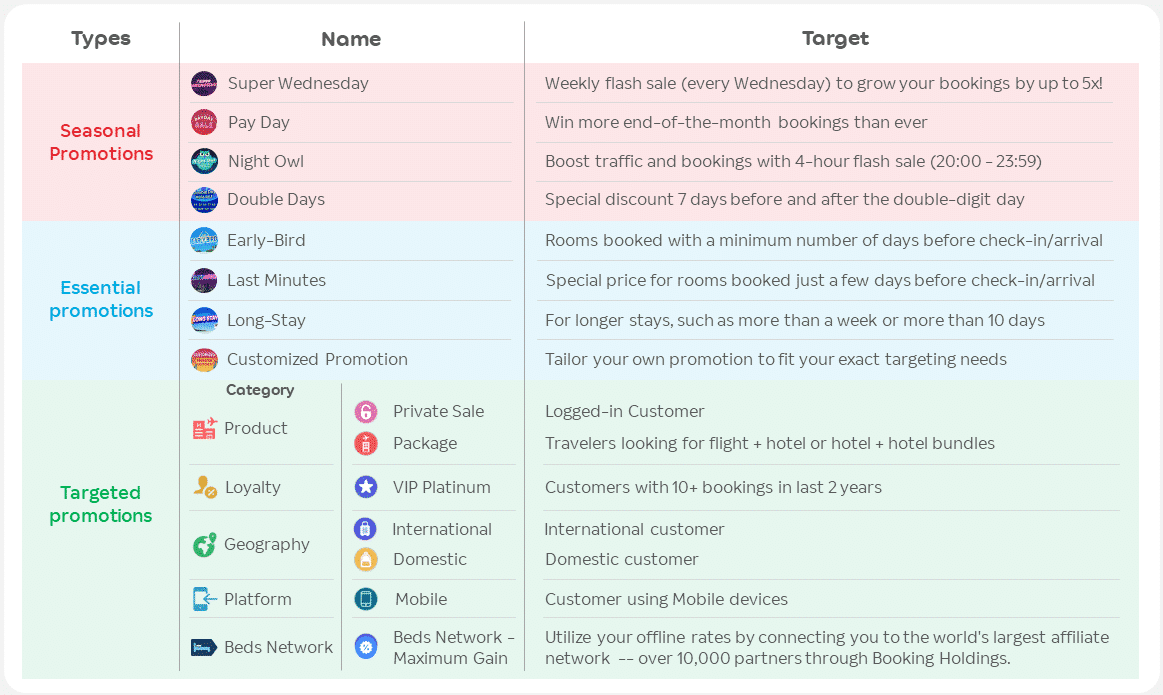 促销活动是一系列营销计划,旨在通过提高曝光度来提升订单量。 促销活动包括在Agoda上有策略地排名或进行广告营销,为客人提供特别优惠或折扣,以及其他营销活动。